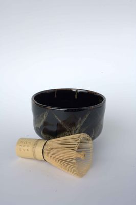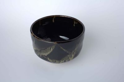 This elegant chawan is a glossy black and tan creation that feels smooth to the touch.